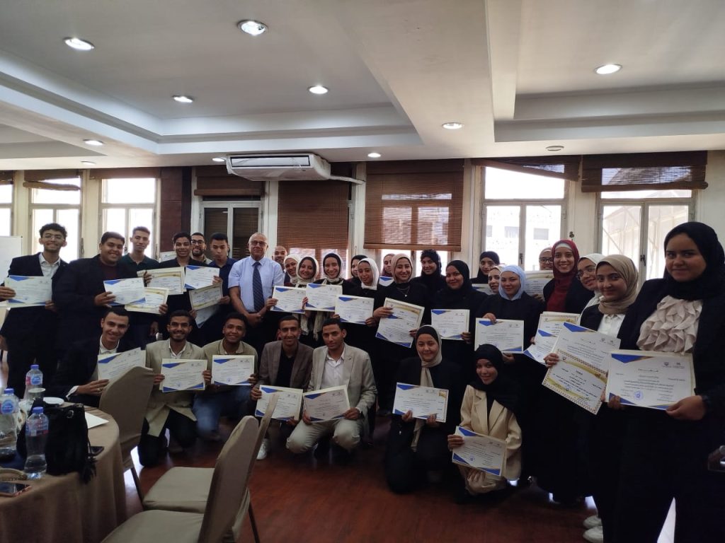 تسليم الشهادات للدفعة الأولى من مبادرة البرنامج التدريبى (الإعداد لسوق العمل) والأستاذ الدكتور/ حافظ الغندور يتوسط متدربى الدفعة الأولى
