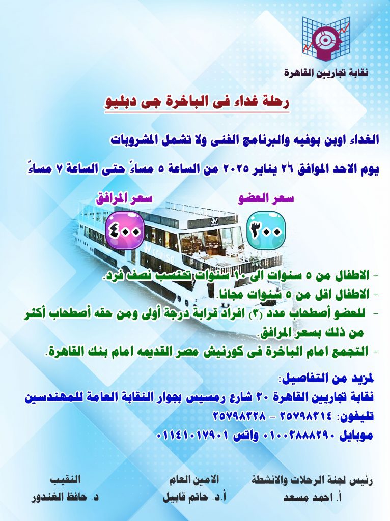 الرئيسية/رحلات ومصايف/رحلة غداء فى الباخرة جى دبليو رحلة غداء فى الباخرة جى دبليو 9 ديسمبر، 2025 9 ديسمبر، 2025 فيسبوك تويتر لينكدإن واتساب تيلقرام
