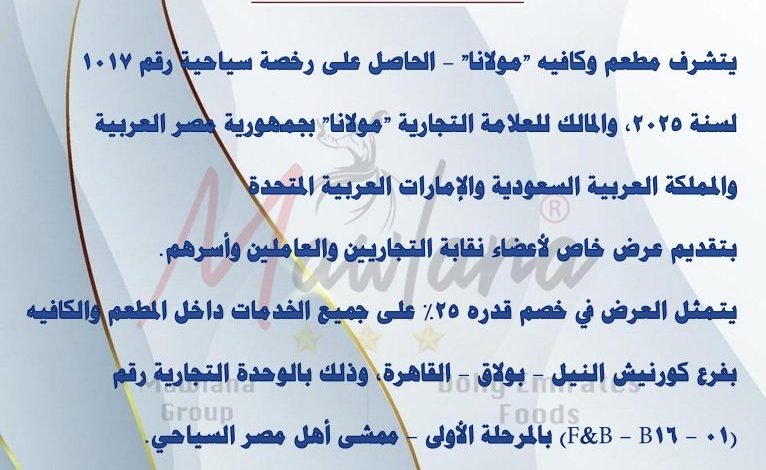 الرئيسية/عروض وتخفيضات/عرض تخفيض من مطعم وكافية مولانا لاعضاء النقابة واسرهم عرض تخفيض من مطعم وكافية مولانا لاعضاء النقابة واسرهم 9 ديسمبر، 2025 9 ديسمبر، 2025 فيسبوك تويتر لينكدإن واتساب تيلقرام