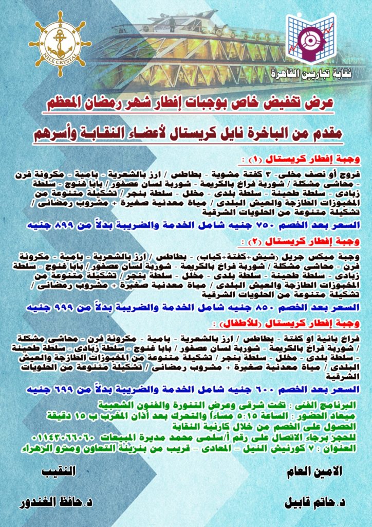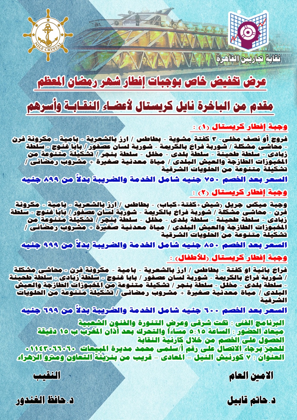 الرئيسية/عروض وتخفيضات/عرض تخفيض خاص بوجبات افطار شهر رمضان المعظم مقدم من الباخرة نايل كريستال عرض تخفيض خاص بوجبات افطار شهر رمضان المعظم مقدم من الباخرة نايل كريستال منذ 12 ساعة منذ 12 ساعة فيسبوك تويتر لينكدإن واتساب تيلقرام